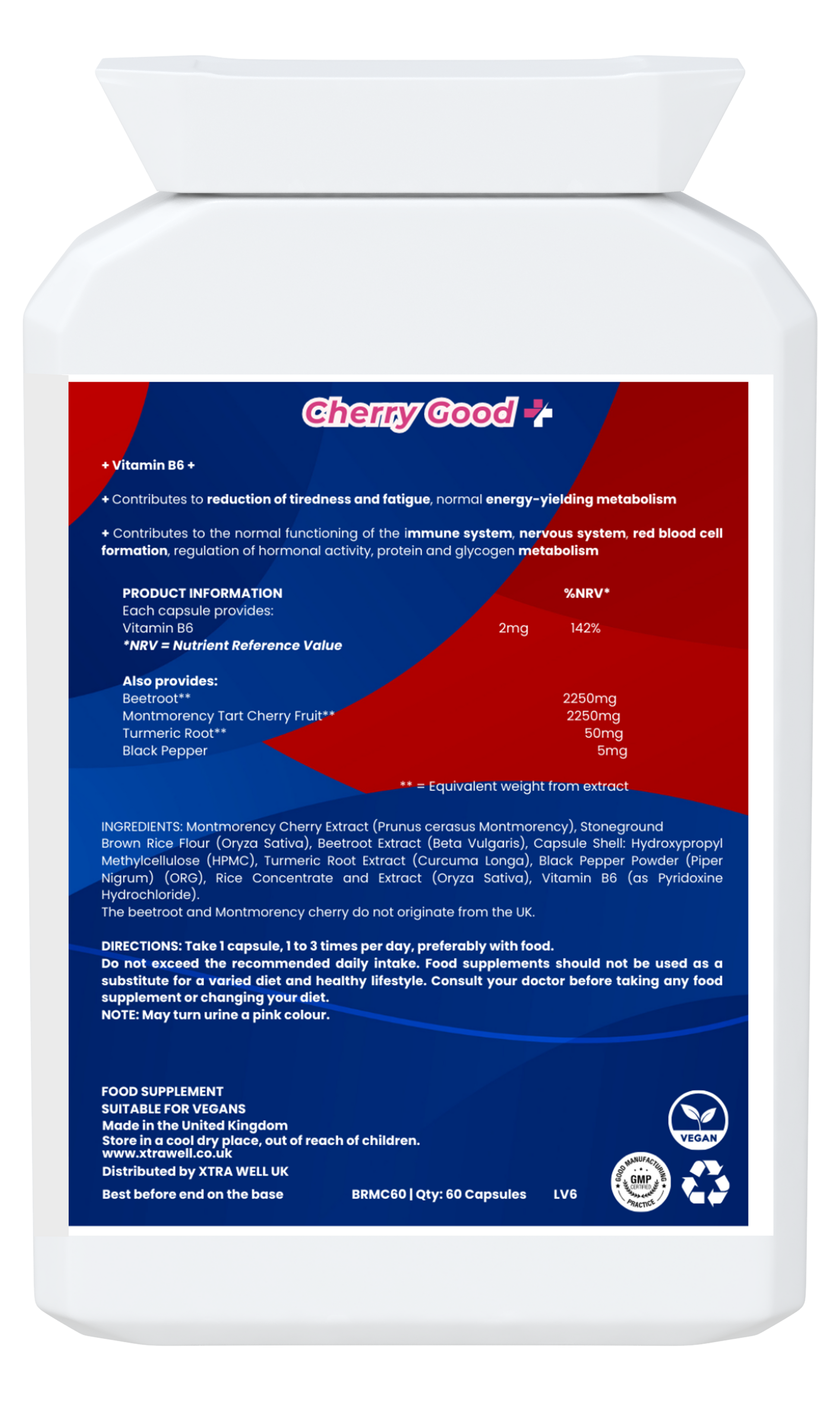 Ingredients: Montmorency Cherry Extract (Prunus cerasus Montmorency), Stoneground Brown Rice Flour (Oryza Sativa), Beetroot Extract (Beta Vulgaris), Capsule Shell: Hydroxypropyl Methylcellulose (HPMC), Turmeric Root Extract (Curcuma Longa), Black Pepper Powder (Piper Nigrum) (ORG), Rice Concentrate and Extract (Oryza Sativa), Vitamin B6 (as Pyridoxine Hydrochloride