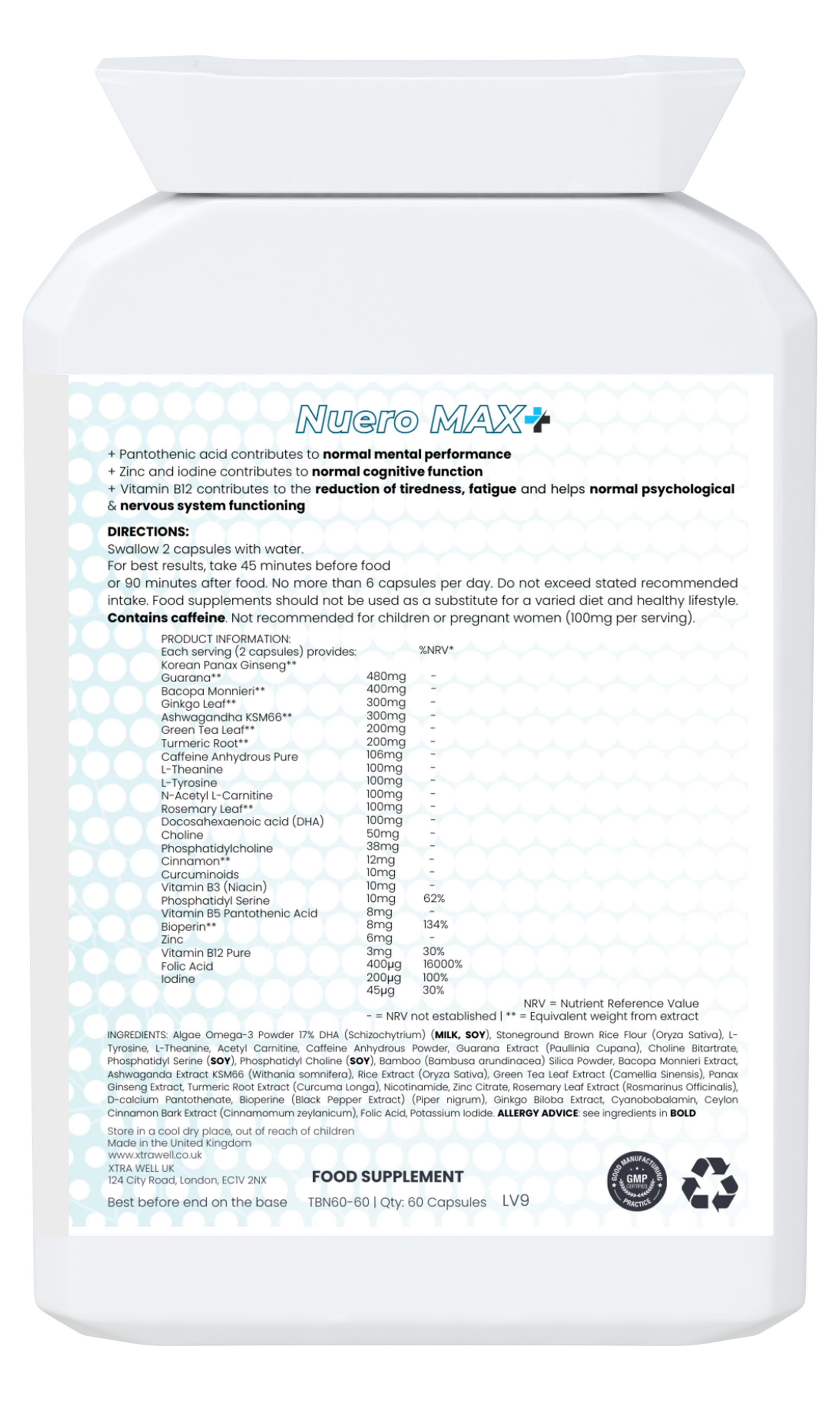 Ingredients: Algae Omega-3 Powder 17% DHA (Schizochytrium) (MILK, SOY), Stoneground Brown Rice Flour, L-Tyrosine, L- Theanine, Acetyl Carnitine, Caffeine Anhydrous Powder, Guarana Extract, Choline Bitartrate, Phosphatidyl Serine (SOY), Phosphatidyl Choline (SOY), Bamboo Silica Powder, Bacopa Monnieri Extract, Ashwaganda Extract KSM66, Rice Extract, Green Tea Leaf Extract, Panax Ginseng Extract, Turmeric Root Extract, Nicotinamide, Zinc Citrate, Rosemary Leaf Extract, D-calcium Pantothenate, Bioperine (Black Pepper Extract), Ginkgo Biloba Extract, Cyanobobalamin, Ceylon Cinnamon Bark Extract, Folic Acid, Potassium Iodide