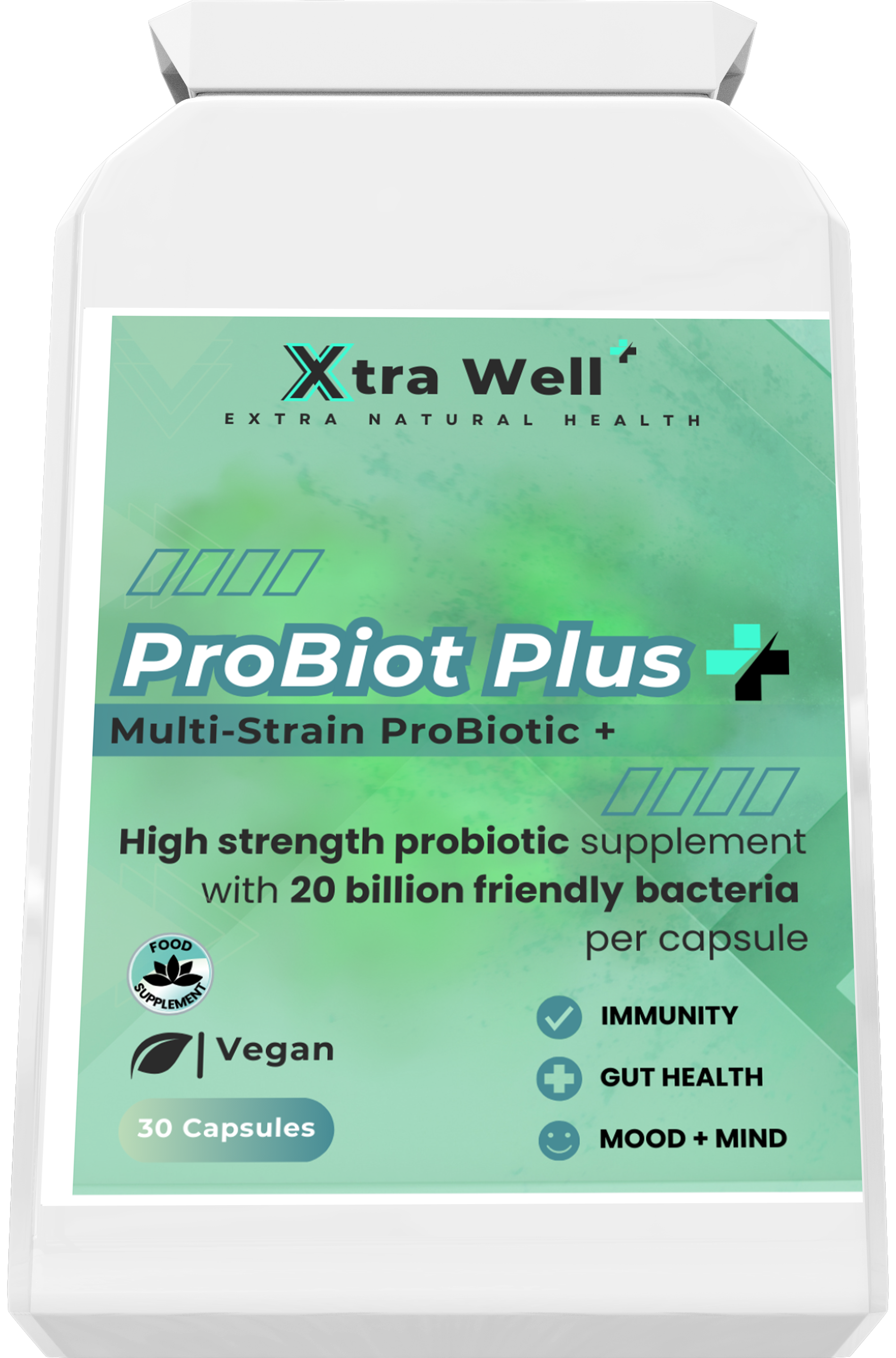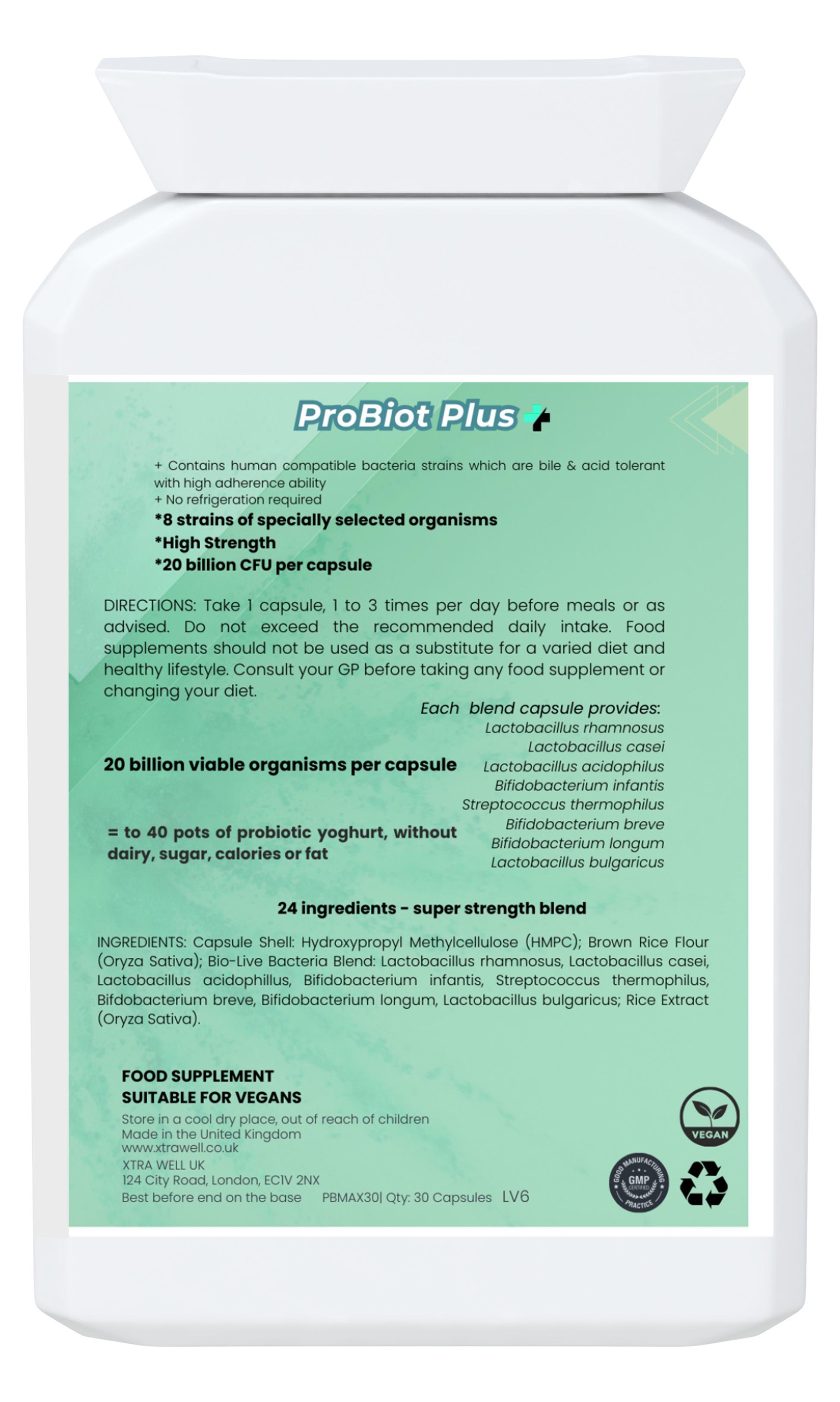 A practitioner-strength, multi-strain probiotic supplement with 20 billion friendly bacteria per capsule equivalent to 40 pots of probiotic yoghurt, without the dairy, sugar, calories and fat
