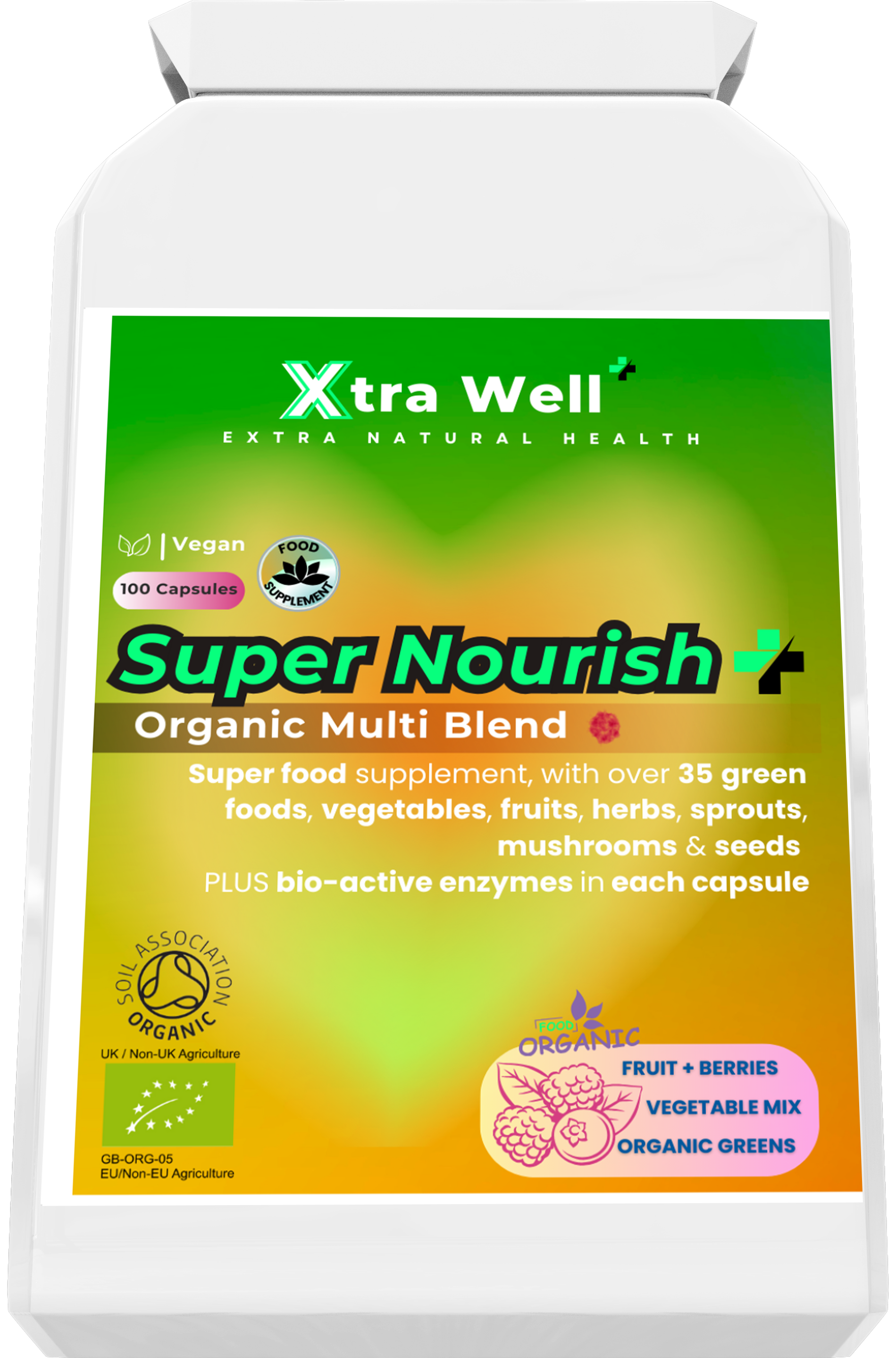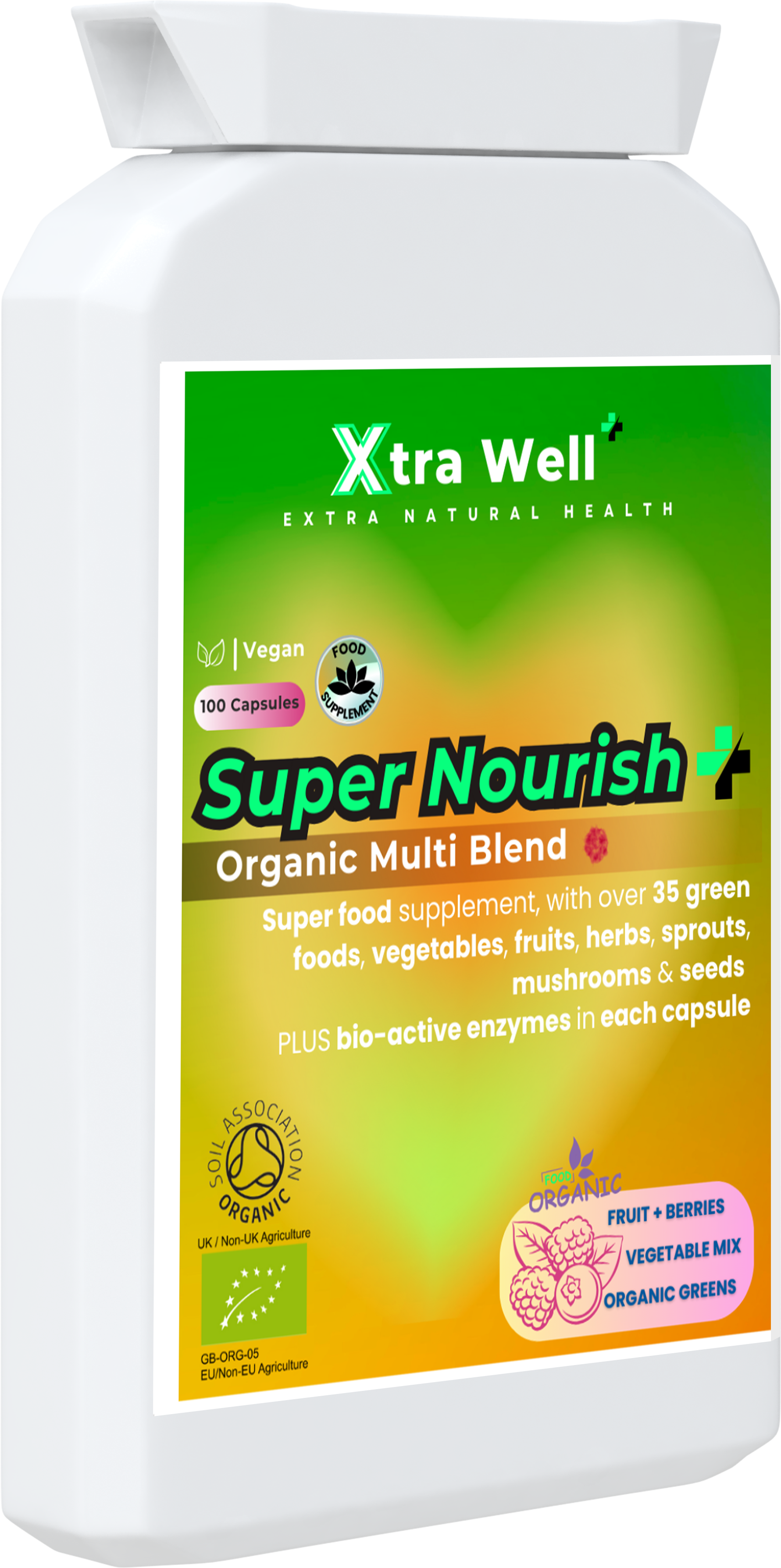 An organic whole food supplement, with over 35 super foods including vegetables, fruits, herbs, sprouts, mushrooms and seeds PLUS bio-active enzymes in each capsule